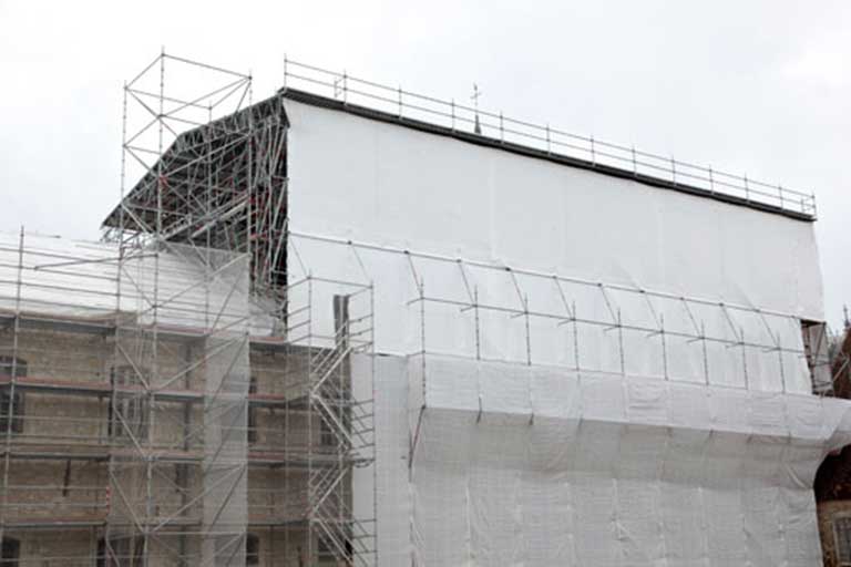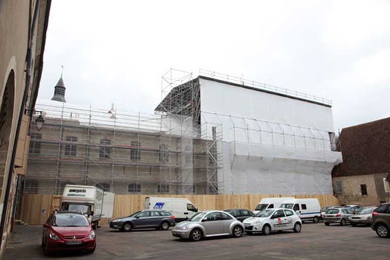 Techniques utilisées : Montage de l’échafaudage parapluie, réfection d’enduits.