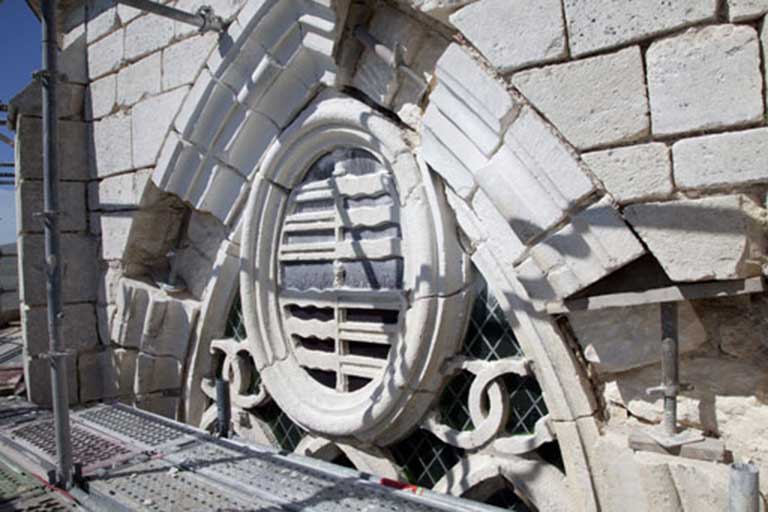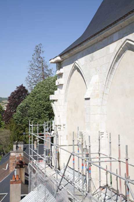 Savoir faire : Échafaudage, compris parapluie pour travaux de charpente, fourniture, taille et pose de pierre, rejointoiement et nettoyage de parements pierre, enduit au mortier de chaux.