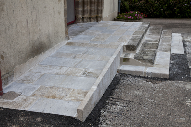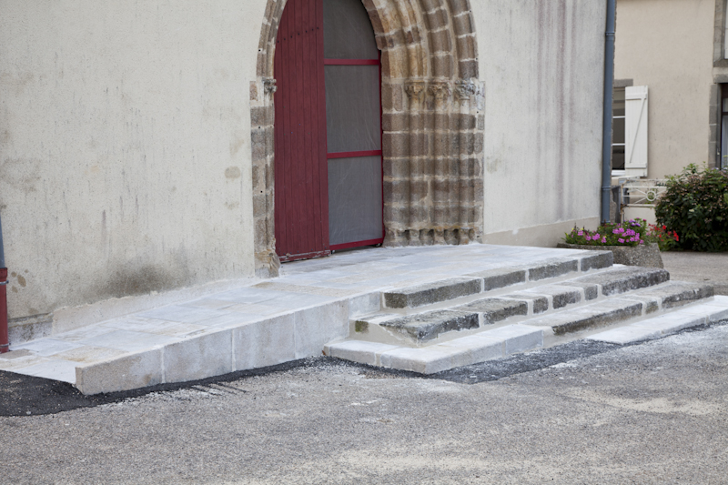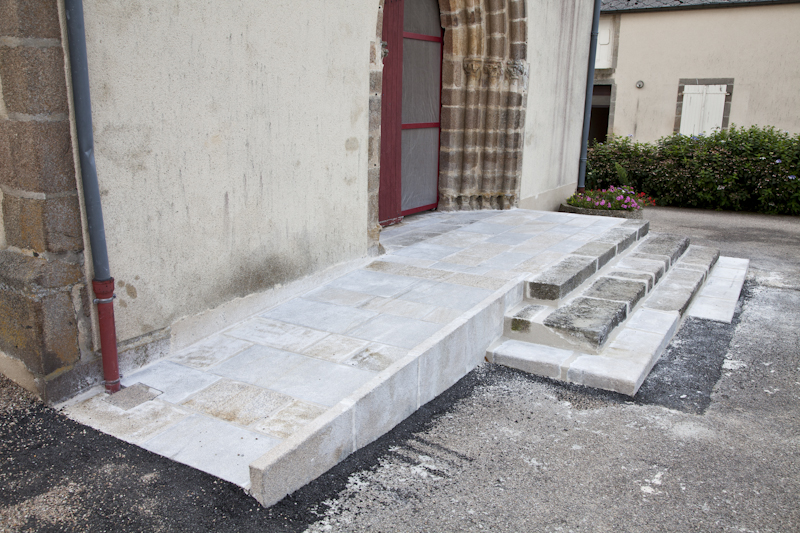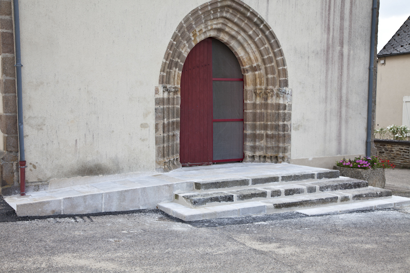 Techniques utilisées : Dépose de l’ancien emmarchement, création d’une paillasse en béton, taille de pierre (escalier), rejointoiement.