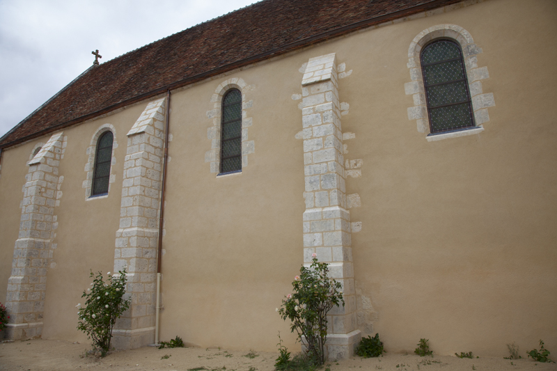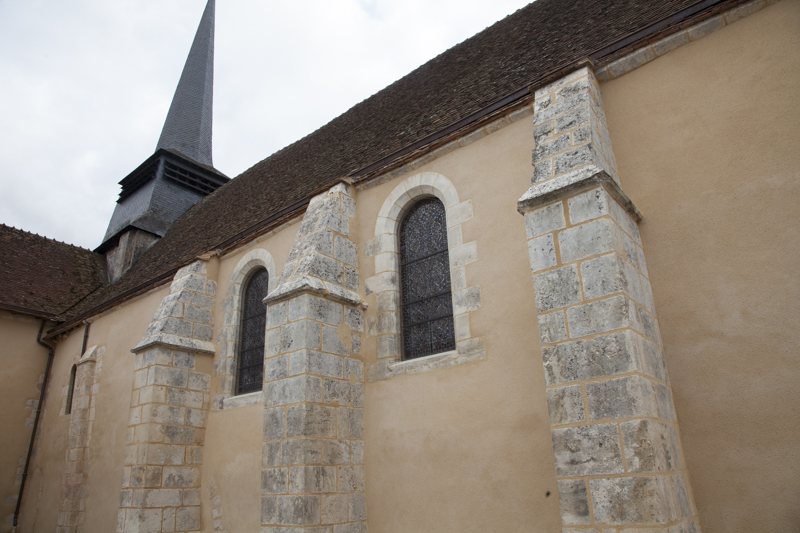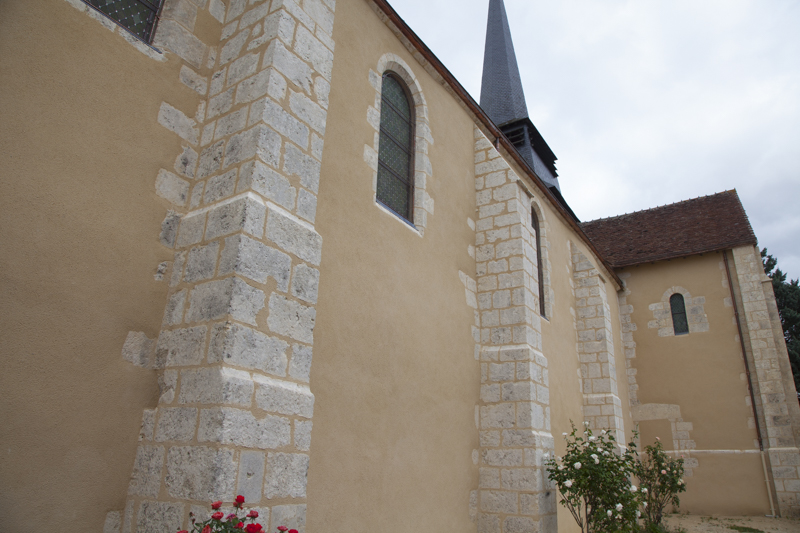 Techniques utilisées : Nettoyage des parements en pierre de taille, changement de pierre de contrefort, enduit et rejointoiement de l’ensemble à la chaux grasse. Ragréage au mortier de pierre pour réparations de différents éclats, patine d’harmonisation sur pierres changées, drainage de la nef, rejointoiement du dallage.