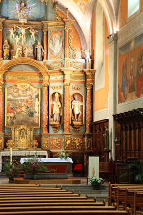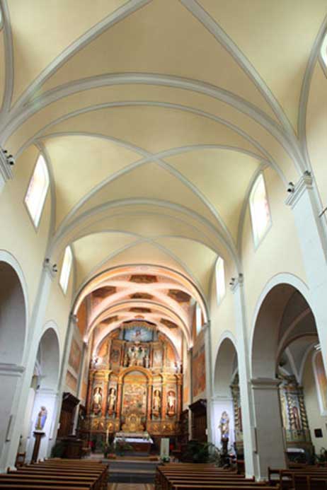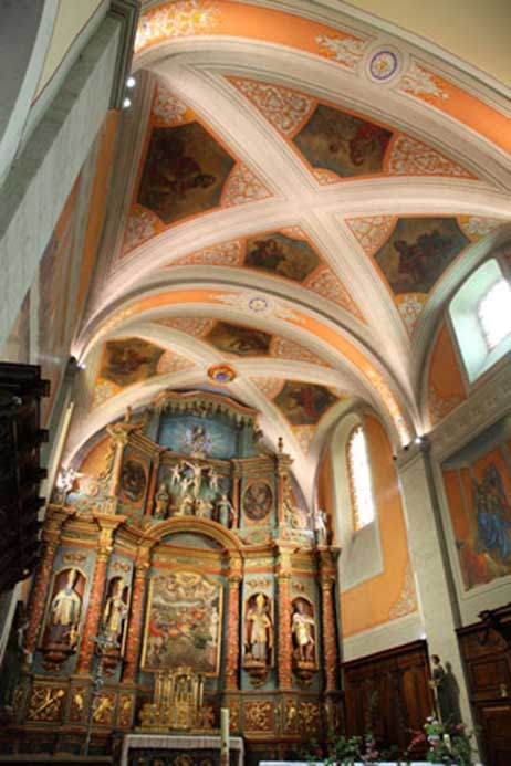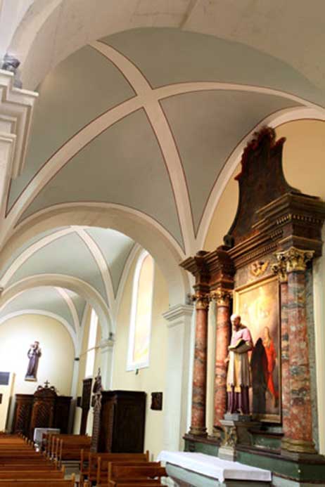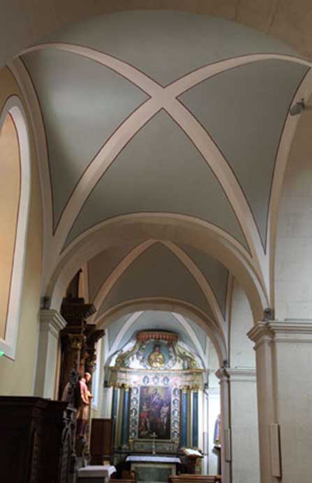 Techniques utilisées : Saignées pour travaux d’éclairage et reprise au mortier de chaux, piquage des enduits et des joints, restauration des piliers de la nef au mortier pierre et application d’un badigeon.