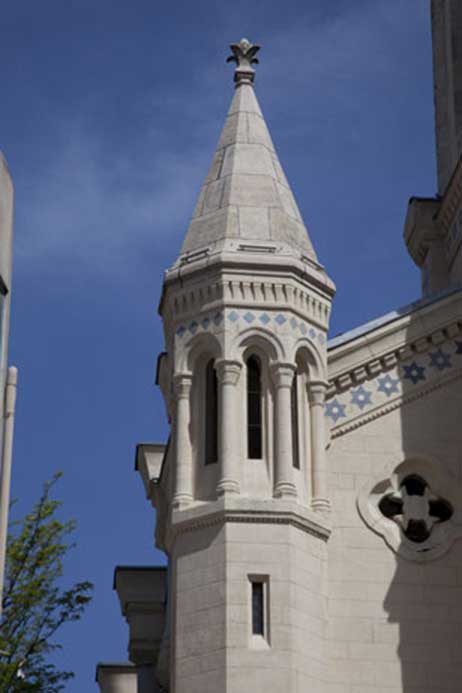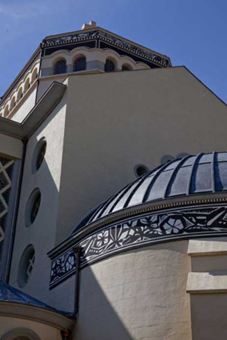 Techniques utilisées : Intervention sur support béton, réalisation d’un enduit imitation pierre, avec joint tiré au fer et application d’un badigeon sur l’ensemble des réseaux.