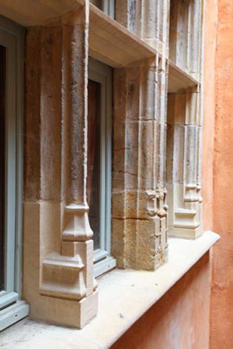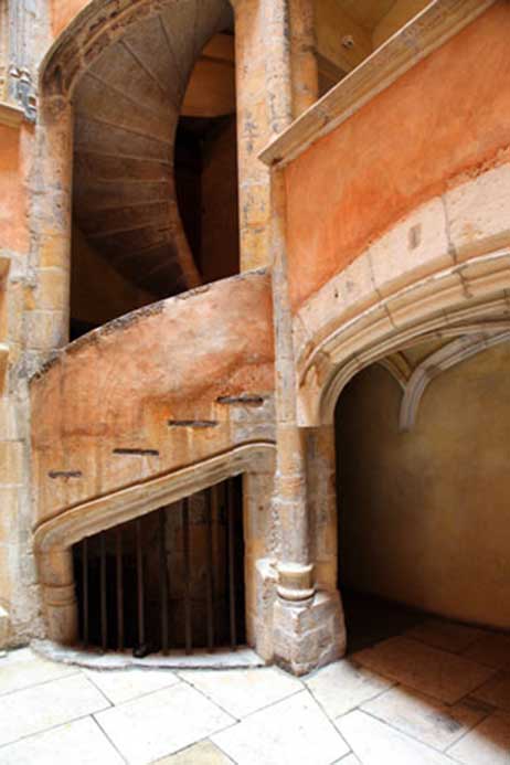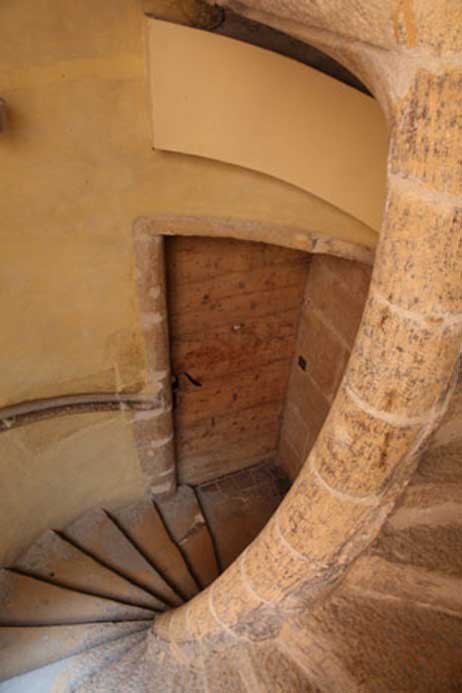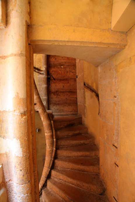 Techniques utilisées : Fourniture, taille et pose de pierre pour restauration d’un escalier en pierre dorée, renforcement par mise en œuvre de tirants au niveau du noyau, ragréage des girons de marche au mortier pierre.