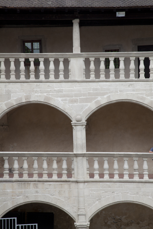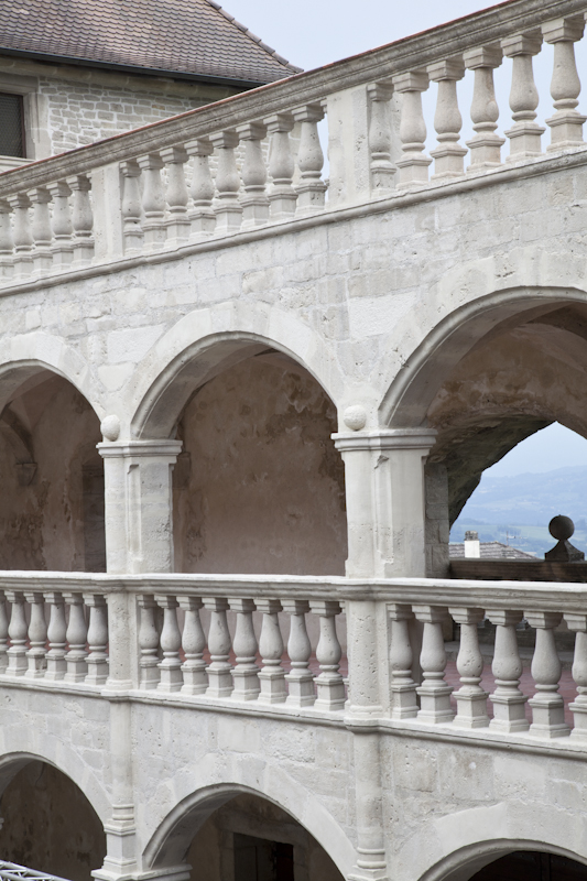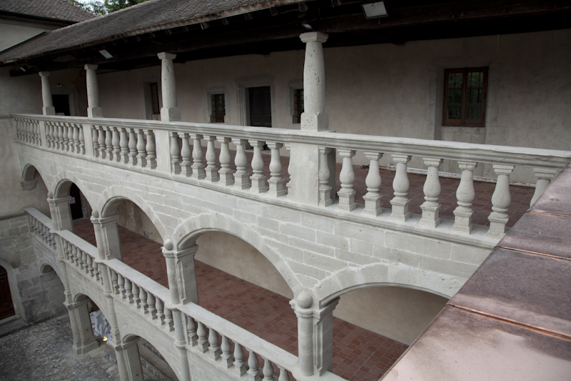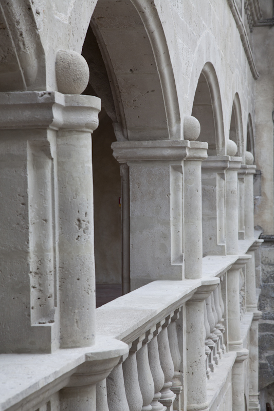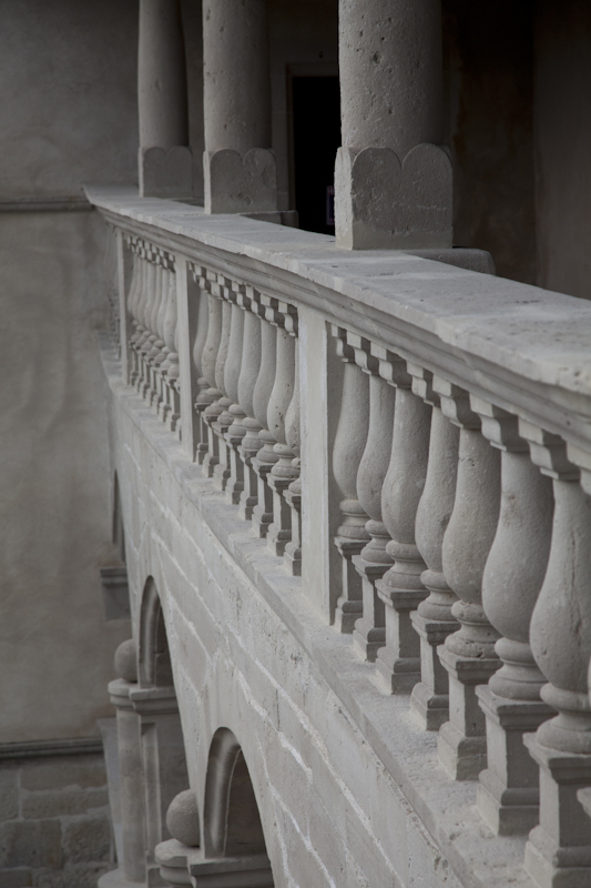 Restauration des balustres des galeries et des ragréages en recherche sur parements.